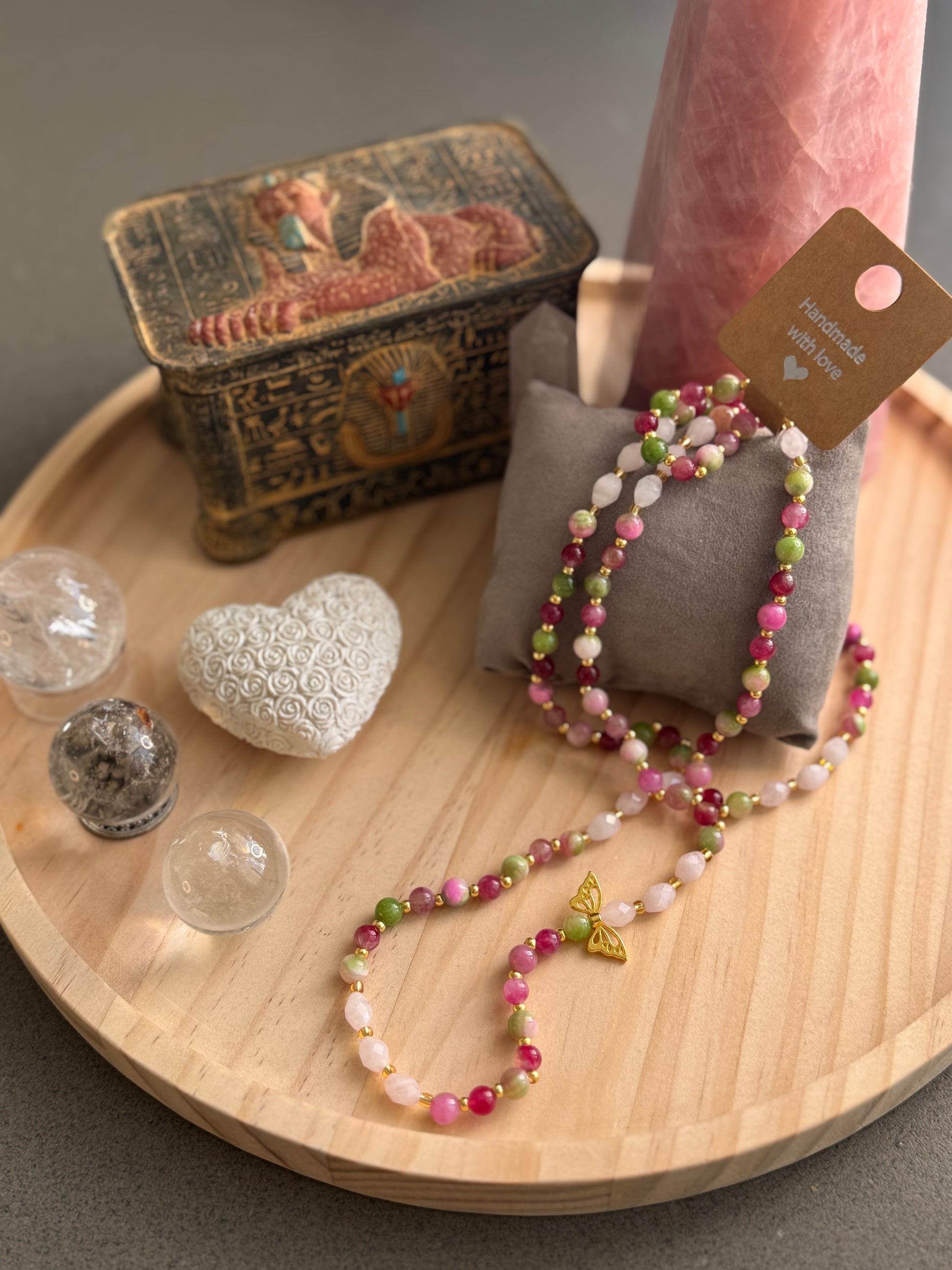 Diese zarte Schmetterlingskette vereint die liebevolle Energie von Rosenquarz, die heilende Kraft des grünen Turmalins und die herzbalancierende Frequenz des Wassermelonen-Turmalins.