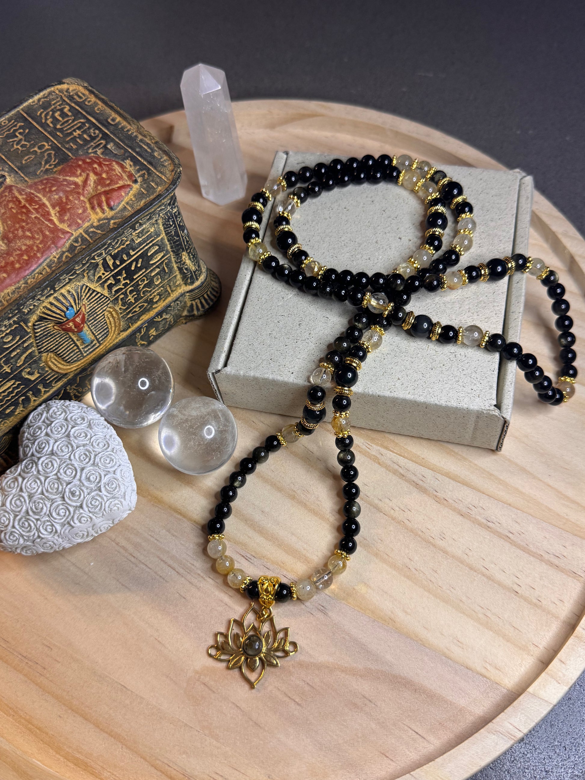 Diese edle Heilsteinkette vereint die lichtvolle Energie des Goldrutils, die schützende Tiefe des Goldobsidians und die transformierende Symbolkraft der Lotusblume – ein kraftvoller Begleiter für dein inneres Gleichgewicht.