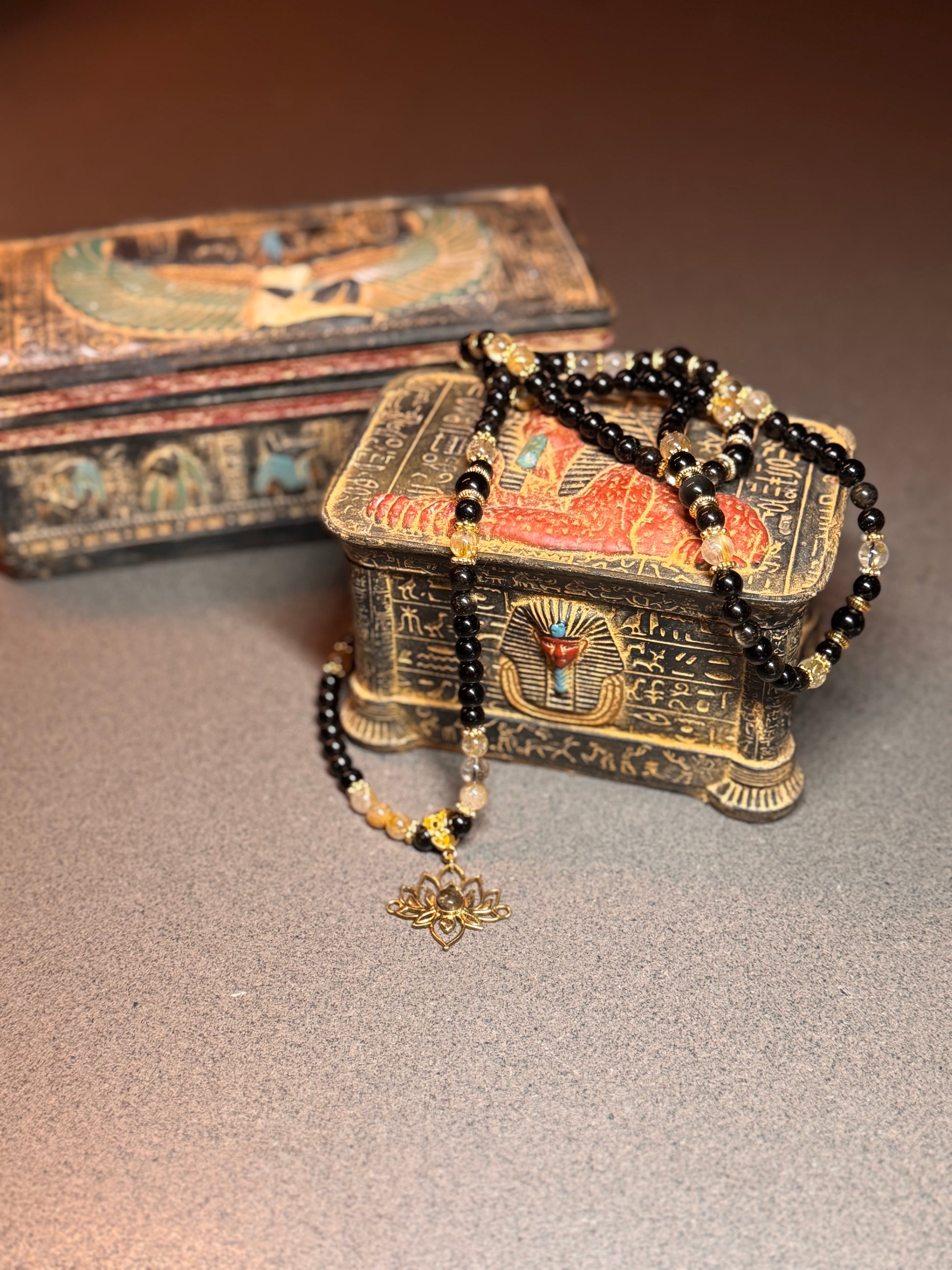Gold-Obsidian & Gold-Rutil Quarz Kette mit Lotusblume – Schutz, Klarheit & spirituelle Kraft (mit Energiearbeit und Talisman)