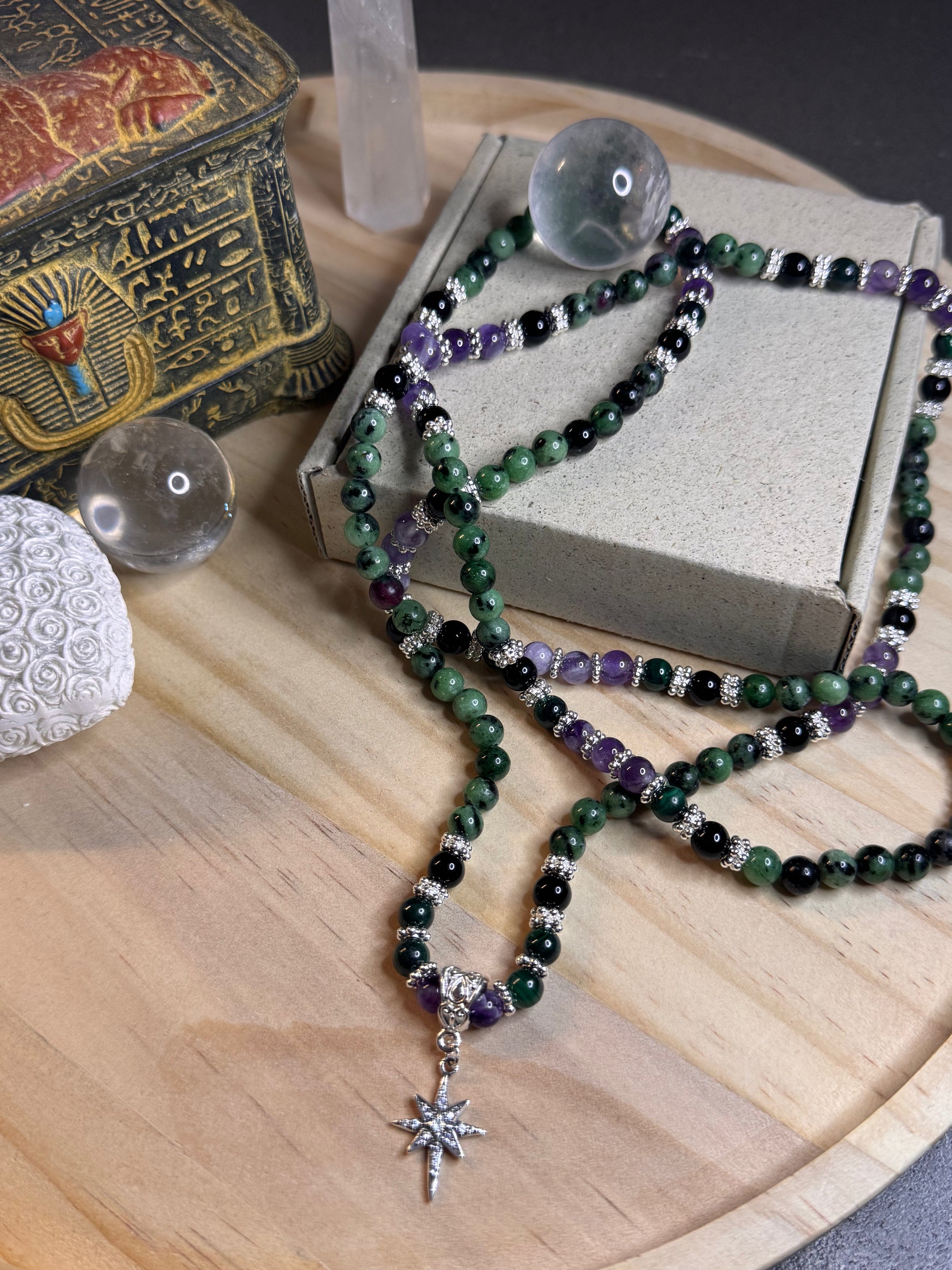 Gefertigt aus Rubin-Zoisit, Malachit, Amethyst und Obsidian, begleitet vom Nordstern in Silber, verbindet sie dich mit deiner inneren Wahrheit – der Sprache deines Bewusstseins.