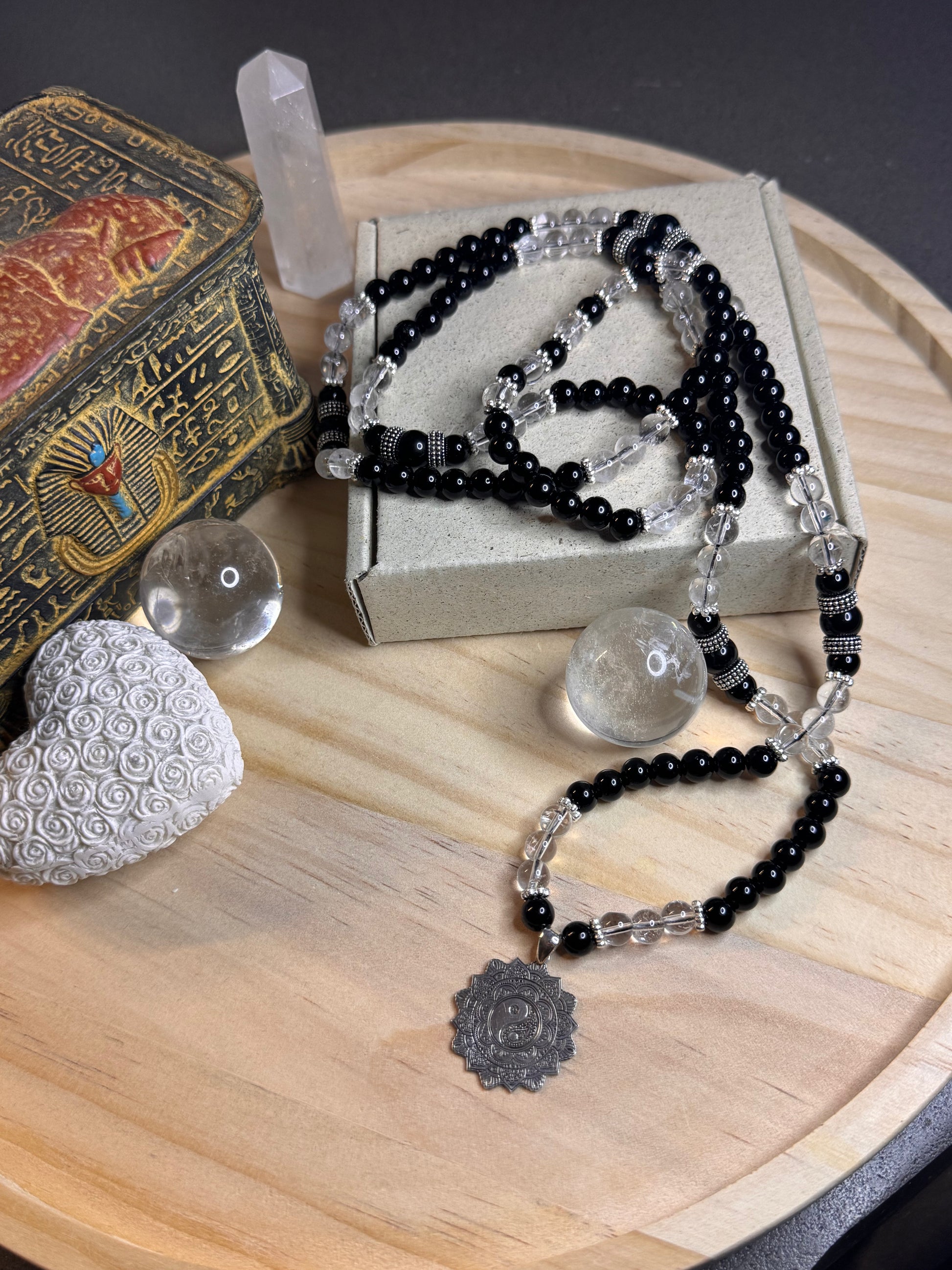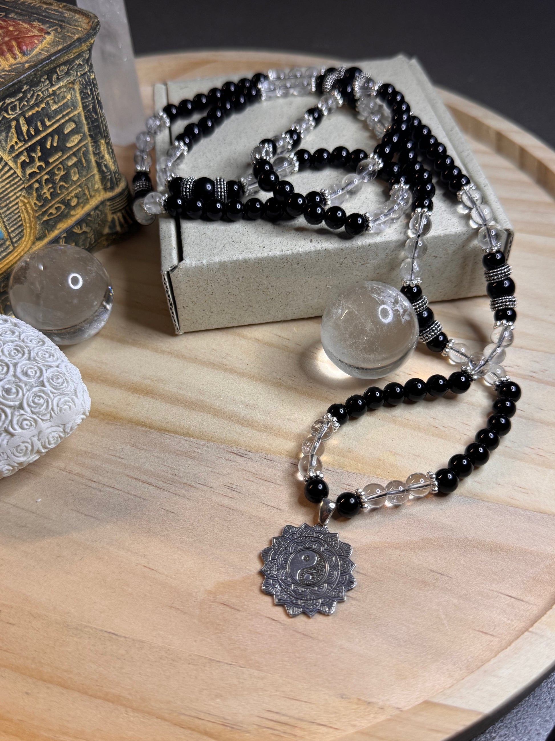 Diese kraftvolle Edelsteinkette vereint Bergkristall und Obsidian – Licht und Dunkelheit, Klarheit und Tiefe.